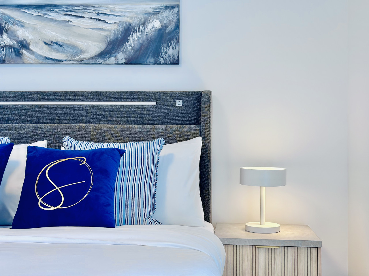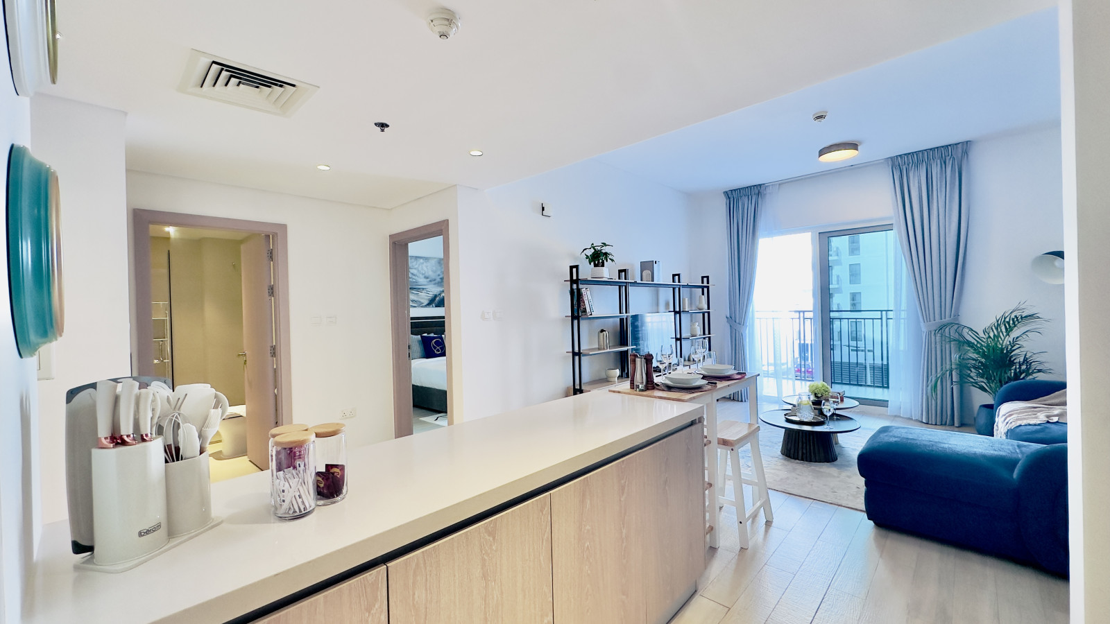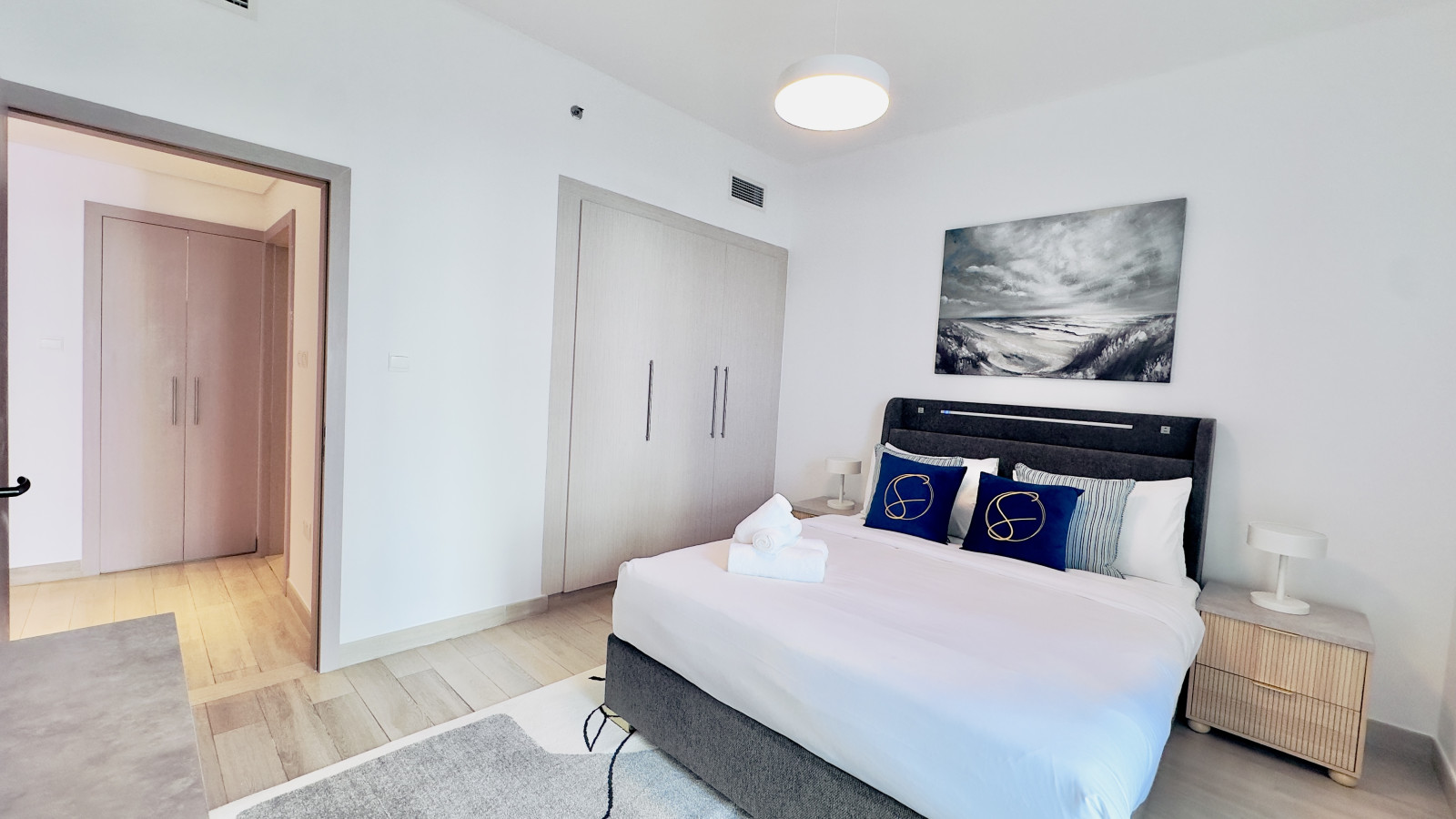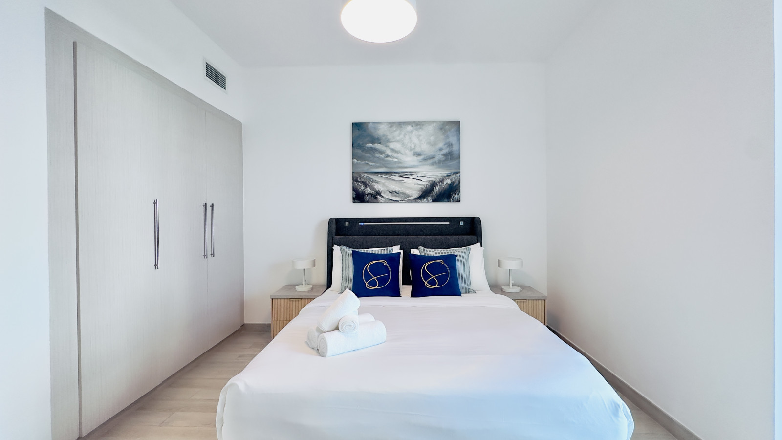 The bedroom features a comfortable queen-sized bed, built-in wardrobes, and blackout curtains to ensure a restful night’s sleep. Fresh linens and towels are provided for every stay.