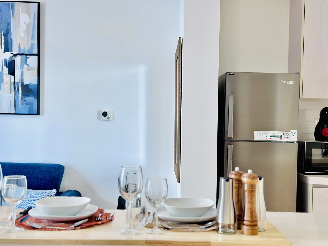 The living space is designed for comfort, with a cozy sofa that converts into a sofa bed, allowing the apartment to accommodate up to 3 guests. A smart TV and high-speed WiFi are available for entertainment and work. The dining area can be used for meals or as a workspace, with access to a private balcony.